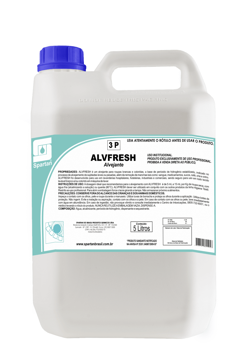 ALVFRESH Alvejante para roupas brancas e coloridas, à base de Peróxido de Hidrogênio, indicado no processo de alvejamento e remoção de manchas, tais como, sangue, suco, medicamento, café, vinho, etc, garantindo menor desgaste do tecido.