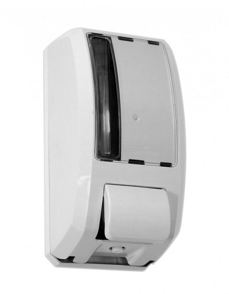 Injetada em plástico ABS branco, possui sistema de válvula, visor cristal transparente, o que permite o controle da substituição do sabonete, fundo e botão na cor branco.