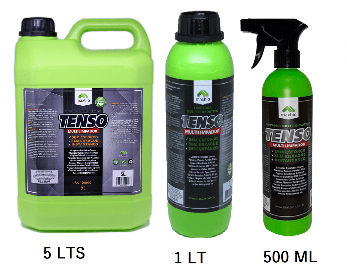 Tenso é o Multilimpador PRONTO USO da Maxbio, que limpa sem esforço, sem enxague todo tipo de superfície lavável! Com este produto você limpa sua cozinha, estofados, manchas de roupas, calçados,armários, pisos enfim tudo que você precisa em 1 só produto. Você aplica na superfície suja de maneira uniforme e remove com UM PANO LIMPO e UMEDECIDO dispensando o enxague. Tenso é Multilimpador indicado para limpeza sob pulverização e sem enxague para todos os tipos de estofados, é eficiente através de simples pulverização como manutenção doméstica bem como quando aplicado com a máquina extratora traz o resultado surpreendente como produto profissional. – Sem esforço – Sem enxague – Instantâneo