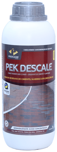 Propriedades e benefícios: • Removedor de resíduos de rejuntes cimentícios. • Limpador de eflorescências. • Limpador pós-obra. • Limpa versos de chapas de mármores ou granitos (remove resíduos de granalhas). • Excelente para a restauração de peças não polidas ou pisos demasiadamente danificados. • Perfeito para granitos, ardósias, cerâmicas rústicas, pedras em geral, mármores não polidos, etc. Modo de usar: Pek Descale é fornecido em estado concentrado. Pode ser diluído em até quinze partes de água. O produto deve ser aplicado sobre a superfície levemente umedecida. Utilize escovas, fibras de limpeza, vassouras de cerdas rígidas ou outro acessório abrasivo compatível com a textura de seu revestimento. Espalhe a solução sobre a superfície e deixe agir durante 5 a 10 minutos. Esfregue bem até a total remoção das impurezas. Caso persistam resíduos, repita a operação com o mesmo tempo de ação e com a mesma diluição. É mais correto repetir o processo várias vezes do que aumentar o tempo de exposição. Em superfícies muito contaminadas pode-se avaliar uma diluição menor desde que se faça teste prévio. O produto poderá ser utilizado puro apenas em revestimentos muito rústicos ou muito danificados (por cimento, intempéries ou sais). Enxágue com água em abundância até remover todo seu resíduo. Concentrado. Fácil de usar. 1 Lt rende até 120m²