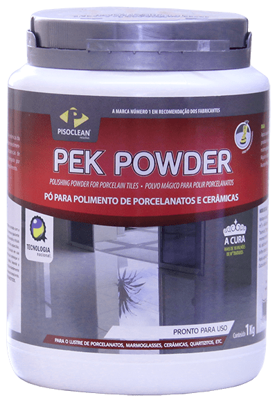 Pek Powder é o único pó para polimento produzido no Brasil e um dos únicos do mundo. Através de ação mecânica, este produto desenvolve o brilho natural dos revestimentos, o lustro final. Perfeito também para recuperação de arranhões superficiais. É produzido para todo tipo de revestimento polido lustrável. Propriedades: Produto que restaura ou corrige o brilho de porcelanatos, e que também recupera cerâmicas esmaltadas atacadas quimicamente ou desgastadas por abrasão. Também utilizado em marmoglass, quartzitos, pinturas epóxi e em alguns tipos de mármores de polimento mais difícil. Com processo de registro de patente em andamento, é um dos principais destaques da Pisoclean. Modo de usar: Aplique uma porção do produto (uma colher de sopa) diretamente sobre a área a ser lustrada (a cada m²) e adicione água para formar um creme. Proceda o lustro com máquinas politrizes com discos “branco”, “bege” ou natural blend (pelo de porco). Passe a máquina lentamente sobre a solução até a mesma ir secando. Passe a máquina até a pasta secar ou sem secar com o máximo de peso possível. Vá adicionando água e produto conforme a necessidade apresentada. Confira constantemente o brilho obtido para determinar mais passadas de máquina ou maior utilização do produto. Após a aplicação lave a área com Limpeza Diária LP, deixe secar e passe o disco seco no piso. Uso profissional. 1 Kg rende entre 40 a 70m²