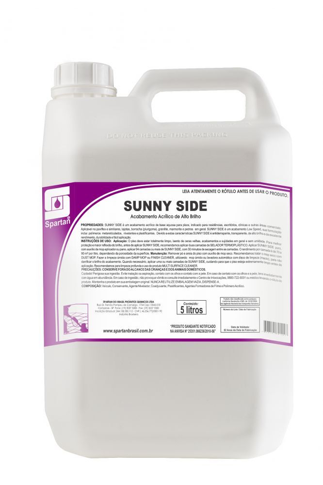 SUNNY SIDE SPARTAN é um acabamento acrílico de base aquosa para pisos, indicado para residências, escritórios, clínicas e outras áreas comerciais. Aplicável no paviflex e similares, lajotas, borracha (plurigoma), granilite, marmorite e pedras em geral. SUNNY SIDE é um acabamento Low Speed, sua formulação inclui polímeros metareticulados, nivelantes e plastificantes. Devido a estas características SUNNY SIDE é antiderrapante, transparente, de alto brilho e de excelente rendimento, durabilidade e fácil aplicação.